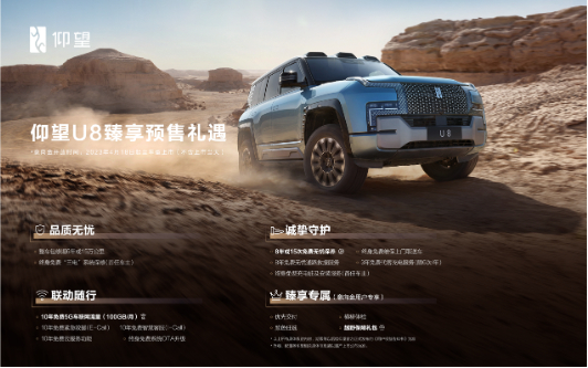 仰望为预订的用户推出了诚意满满的预售权益政策。仰望U8豪华版将于今年9月开始正式交付,仰望U8越野玩家版将于晚些时间启动交付。以极致技术与产品,仰望U8重新定义了新能源高端硬派越野,为用户带来前所未有的安全、性能和体验。