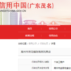 | 行政相对人名称 | 高州市荷花镇陈海英玩具店 | ||||
