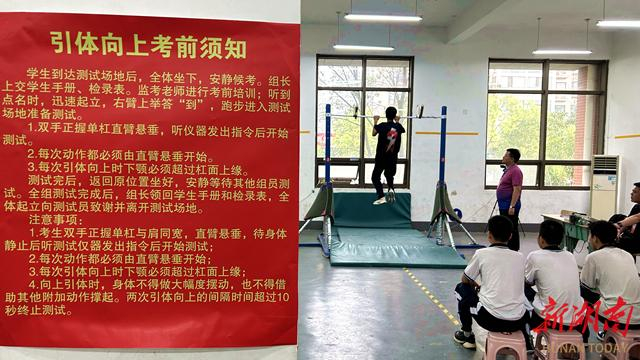 考场内,在显眼处均张贴着项目考前须知,监考老师也会对考试各个环节进行耐心详细地解答。当引体向上(男)项目某位考生咬牙坚持完成最后一个动作平稳落地时,等待考试的同学们都为他热烈鼓掌。