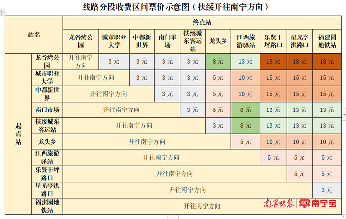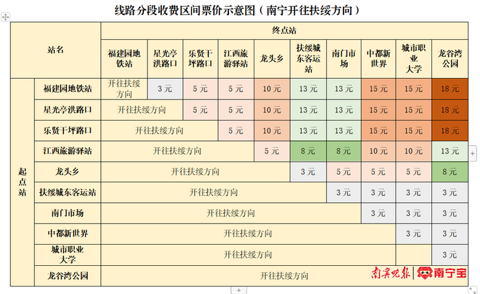 根据旅游性客流出行特点,线路采取在周末及节假日期间运行南宁福建园地铁站至扶绥龙谷湾公园全段,其他时段仅运行南宁福建园地铁站至城市职业大学区段(视客流实际也可随时调整为全段行驶)。