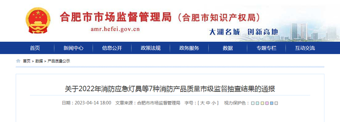 中国质量新闻网讯 2023年4月14日,合肥市市场监督管理局网站通报2022年消防应急灯具等7种消防产品质量市级监督抽查结果。