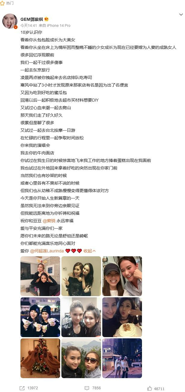 无法去婚礼现场!邓紫棋发长文祝福闺蜜何超莲大婚,自曝18岁相识:看着你从包包脸成长为大美女,祝永远幸福