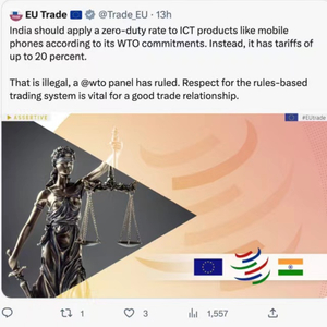 欧盟方面认为,这些关税直接违反了WTO规则,因为印度有义务根据其WTO承诺对此类产品实行零关税。2019年,欧盟和同样受到影响的日本等方在WTO对此进行提告。