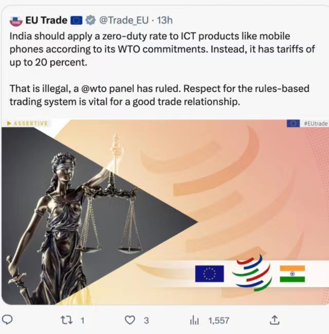 具体而言,在WTO的专家组判决中,WTO支持了欧盟对印度的所有诉求,并认定印度对某些ICT产品(例如手机)征收高达20%的关税不符合其对WTO的承诺,因此是非法的。