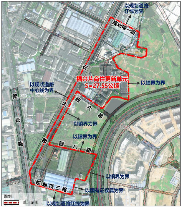 该单元北至规划横 一路、南至规划横三路、西至石大路、东至大岭山镇行政边界,用地面积为27.55万㎡,是工业改商住用地。