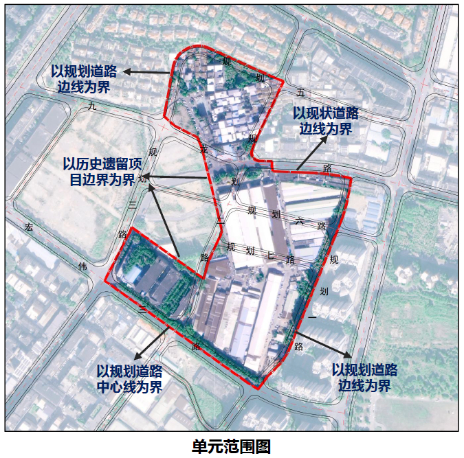 单元2北至蓝郡小区、东至规划一路、规划二路,南至宏伟三路,西至规划二路、规划三路及历史遗留项目认定的边界。现状以工业用地、农村宅基地为主。