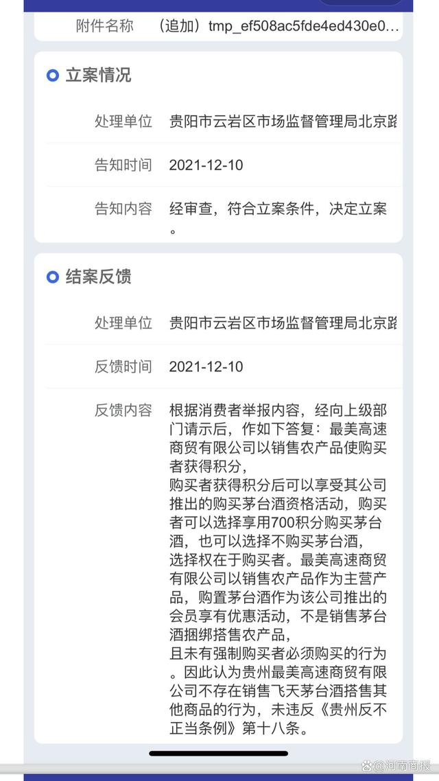 记者注意到,2021年11月,有消费者在全国12315平台举报前述网络商城要求购买700元农产品换取700积分,才能以“1499元+700积分”的价格购买55°飞天茅台酒。消费者认为存在销售茅台酒搭售其他商品的行为,违反了《贵州省反不正当竞争条例》第十八条规定。