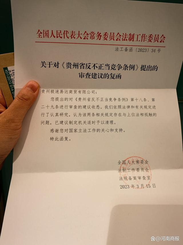今年3月15日,全国人大常委会复函称:“您提出的对《贵州省反不正当竞争条例》第十八条、第二十九条进行审查的建议收悉。我们依照法律和有关规定进行了认真研究,认为该两条相关规定存在与上位法相抵触的问题,已建议制定机关适时予以清理。”