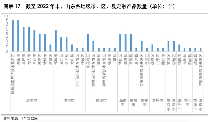 据天风证券统计,2021年以来山东省共计发行161款定融产品,位居全国第一。其中,潍坊、济宁、聊城、淄博、德州位列前五。而YY评级统计的定融数据库中,截至2022年10月末,264个定融产品中,122个是由山东区域内的国有企业发行,且大部分为债务压力大的地级市区县城投主体,包括潍坊、济宁、淄博等下辖区县。