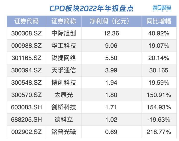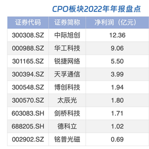 据不完全统计,目前已有9家CPO相关上市公司发布2022年业绩报告,其中8家业绩报喜。龙头剑桥科技2022年实现净利润1.71亿元,同比增长154.93%。仅德科立1家公司去年净利录得同比下滑,去年净利润为1.02亿元,同比下降19.63%。