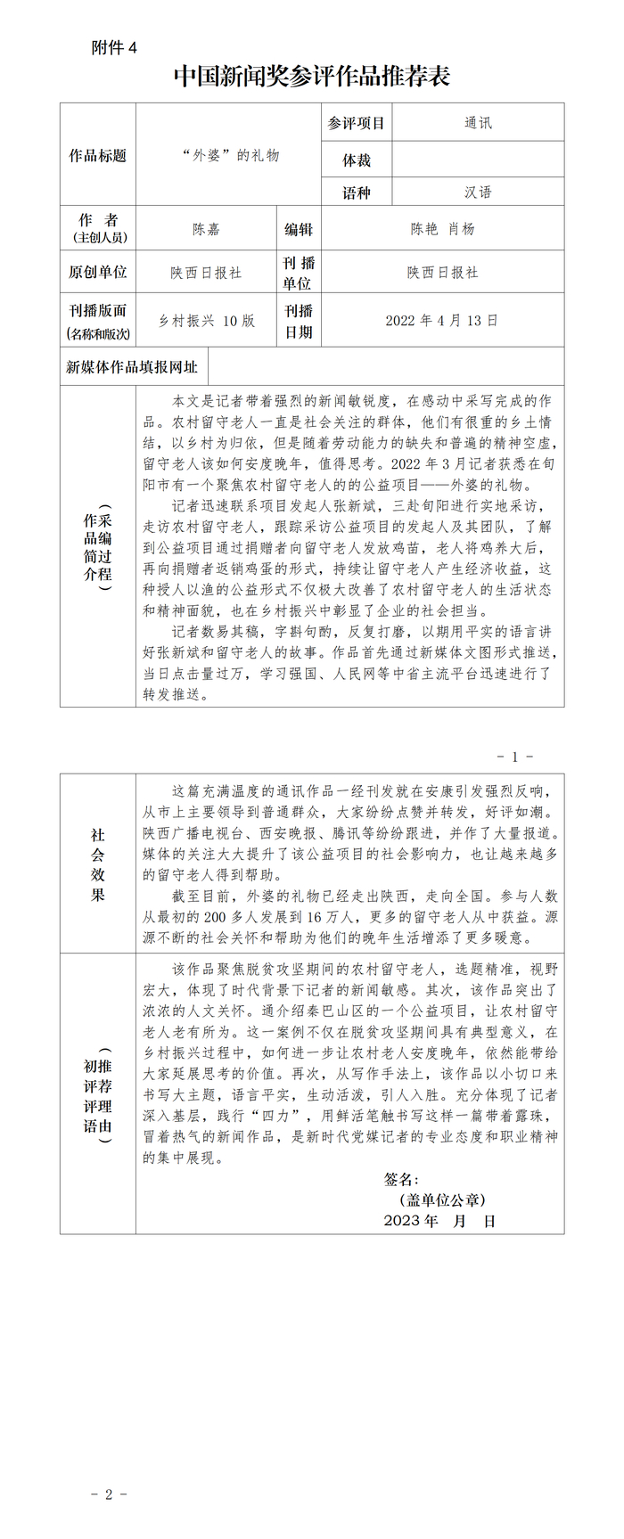 报送第33届中国新闻奖参评作品公示:“外婆”的礼物