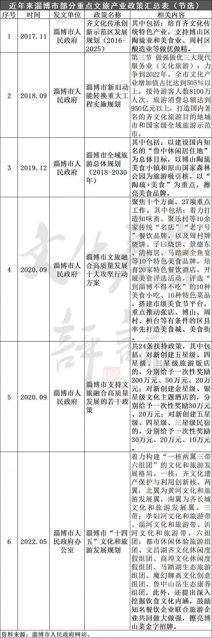 2018年9月,淄博市人民政府印发了《关于印发淄博市新旧动能转换重大工程实施规划》,把繁荣发展文化旅游产业纳入“做强做优三大现代服务业”重点任务。明确提出,力争到2022年,全市文化产业增加值占比达到5.5%以上,接待游客人数8100万人次,旅游消费总额达到950亿元以上,打造国内著名的齐文化旅游目的地城市和国家级全域旅游示范市。