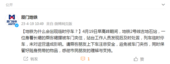 4月19日早高峰期间,地铁2号线古地石站,一位身着长裙的乘客裙摆被车门夹住,站台工作人员发现后及时处置,列车临时停车,未对运营造成影响。请乘客朋友上下车注意安全,避免被车门夹伤,同时保管好随身携带的物品,感谢市民朋友的理解与支持。