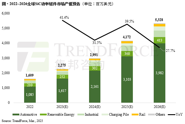 TrendForce集邦咨询在调研报告中预测,随着上述企业扩产与应用市场的明朗化,预计将推动2023年整体碳化硅功率元件市场产值达22.8亿美元,年成长41.4%。至2026年碳化硅功率元件市场产值可望达53.3亿美元。市场前景广阔。