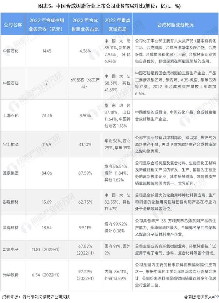 从企业业务布局来看,中国石化和中国石油是我国生产合成树脂的重要企业,两家企业合成树脂产量占全国产量的25%以上,但企业业务较多,合成树脂业务占比不高;圣泉集团、彤程新材、星辉环材等企业合成树脂业务占比均在60%以上,其中圣泉集团的酚醛树脂、呋喃树脂产销量规模位居国内第一、世界前列;区域布局方面,我国合成树脂上市企业主要在国内开展业务,部分企业有少量的海外业务。
