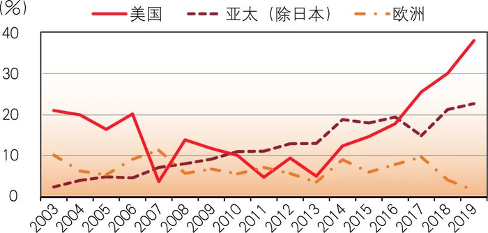 图2 2003—2019年各地区收入对三菱日联集团贡献度