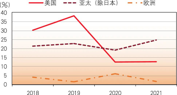 图3 2018—2021年各地区收入对三菱日联集团贡献度