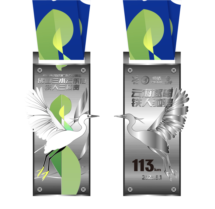 奖牌上印有“云海逐鹭,铁人驰骋”的赛事口号,体现了本次铁人三项赛对参赛者能享受云东海生态美景的同时,能勇于驰骋,挑战自我的美好祝愿!