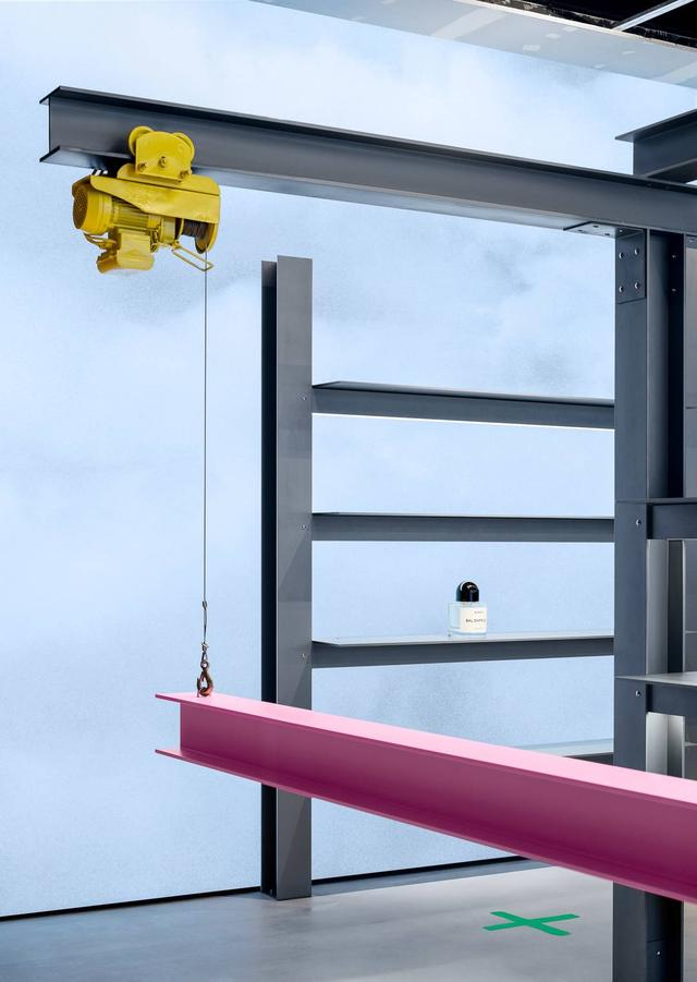 该店呈现出一种“未完待续”的建筑概念, 仿若一件“半成品”,等待下一个独特创意的到来。工业风的设计理念贯穿始终,明黄色的起重机装置于天花板上,栩栩如生的“建筑工人”塑像立于梯子顶端,成为店铺设计的一部分,以此注入更为丰满的现实主义色彩,传达出品牌颇具实验性的理念。该旗舰店将呈现品牌全线品类,包括经典香氛、居家香氛、身体及手部护理产品、先锋美妆以及Byproduct系列。