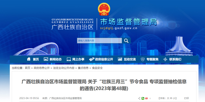 中国质量新闻网讯 2023年4月19日,广西壮族自治区市场监督管理局网站发布关于“壮族三月三”节令食品专项监督抽检信息的通告(2023年第48期)。