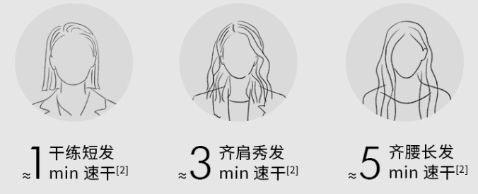 短发约1分钟可吹干, 齐肩长短的头发约3分钟可吹干,齐腰长发也只需5分钟左右就能速干。