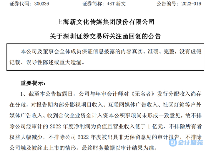 截至本公告披露日, 根据获取的资料,会计师认为《无名者》的发行与新文化的日常活动无关,该业务不应计入 2022 年主营业务收入。若相关分歧在年报披露日无法消除,则不排除《无名者》 影视项目收入无法计入 2022 年度主营业务收入, 不排除公司经审计的 2022 年度净利润为负值且营业收入低于 1 亿元,不排除公司 2022 年度被出具非无保留意见的审计报告,不排除公司触及被终止上市的情形。
