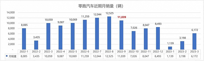 可惜零跑的销量并没有取得预期的暴涨,3月共计交付新车6172台。虽然环比数据可观,但那是因为2月的销量太低所致,仅为3198辆。而作为对比,2022年3月零跑汽车共计交付10059台。也就是说,在全面降价之后,零跑销量同比不增反降。