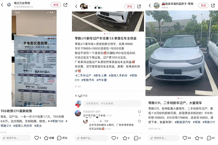「新熵」在社交平台上也发现众多零跑体验中心在售卖过户新车。并且一名零跑销售更是直言“去年年底新车上牌,厂家承诺享受首任车主权益”。值得一提的是,早在去年9月,就有网友发布了零跑C11有大量二手纯新车过户的售卖消息。