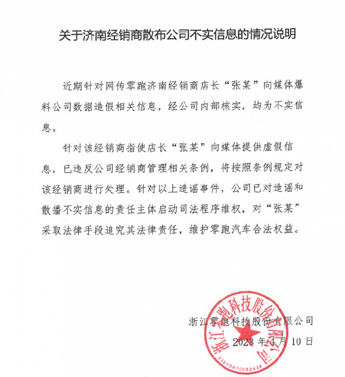 本是利益共同体的经销商突然“反水”,让零跑意识到了问题的严重性,当即出具了公告称,相关爆料经公司内部核实,均为不实信息;并认为其违反经销商条例,要走法律程序追责。