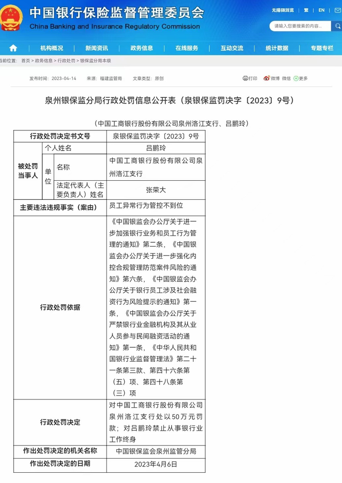 罚单信息显示,中国工商银行股份有限公司泉州洛江支行员工吕鹏玲被予以“禁止从事银行业工作终身”的处罚,当事支行也因“员工异常行为管控不到位”被处于50万元罚款。