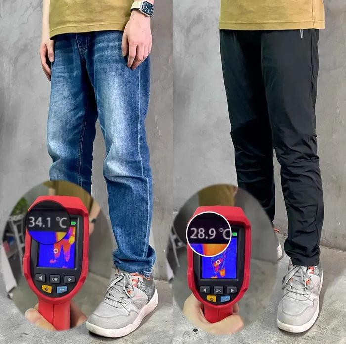 在同样的环境下,用手接触面料,普通面料上的余温会残留很久。而冰丝面料降温超级快,红彤彤的手印很快就降温、变蓝了!夏天穿着这样的长裤,“爽”就一个字。