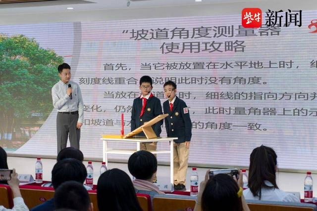 成果汇报环节中,学校师生以具体的课堂样态、项目学习案例进行展示。“量角器可以测量平面中的角度,生活中的角度该如何测量呢?校门前百步坡坡道的角度可以被测量吗?”《坡道角度测量器的秘密》中,四年级学生在数学课上认识了量角器后,却产生了新的思考。在数学老师杨浩的建议下,同学们研究设计出一个测量工具,成功测量出百步坡的坡道角度。
