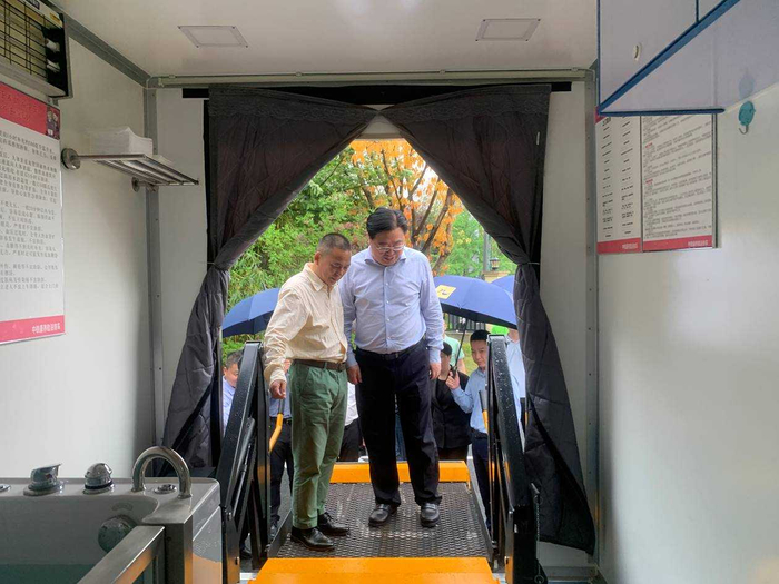 在助浴快车项目现场,重庆三心堂养老服务有限公司创始人隆全明向九龙坡区委书记李春奎汇报项目运行情况和助浴快车内部功能。
