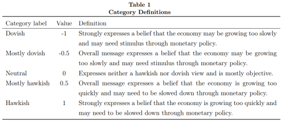 两位研究人员随机抽取FOMC公告中的500 个句子,然后由人类判断是“鸽派”“基本鸽派”“中性”“基本鹰派”还是“鹰派”,对应数字分别为-1、-0.5、0、0.5和1。