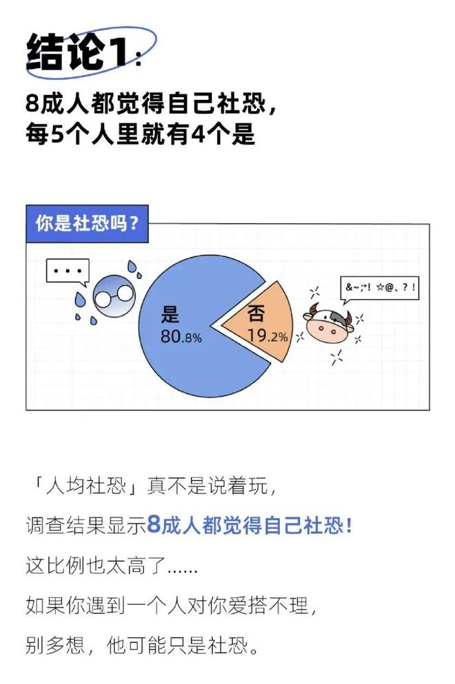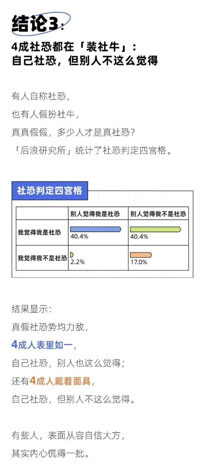 调查结果显示:真假社恐势均力敌,4成人表里如一,自己社恐,别人也这么觉得;还有4成人戴着面具,自己社恐,但别人不这么觉得。