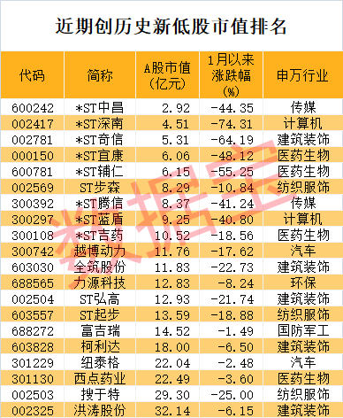 证券时报·数据宝统计,不含北交所及近一年上市的次新股,共38股4月以来股价创下历史新低。8只创新低股A股市值不足10亿元,且清一色为ST股,包括*ST蓝盾、*ST腾信、ST步森、*ST辅仁、*ST宜康等。