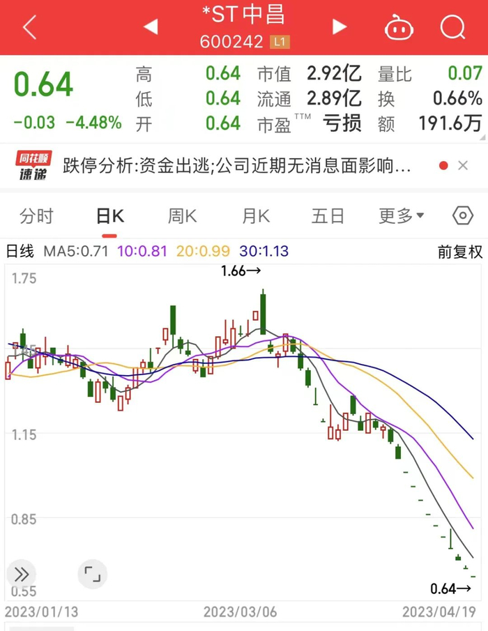 该股本轮大跌始于4月初,4月4日遭遇第一个跌停。当晚,*ST中昌发布业绩预告,更正暨退市风险提示公告。