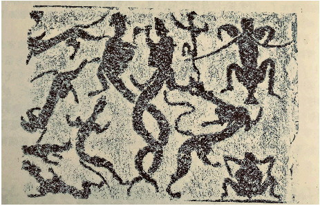 显然,董家庄汉墓里的两幅伏羲女娲像是要通过呈现蛇身交尾状态,表达生命繁衍和男女之间的阴阳互补关系。人首鳞身蛇躯源自上古神话。至于他们为什么被赋予蛇躯?我们可以尝试着解读:先民可能认为,自然界中的蛇,能够冬眠、蜕皮、出蛰、复活……年年岁岁,周而复始。这个习性切合生生死轮回。