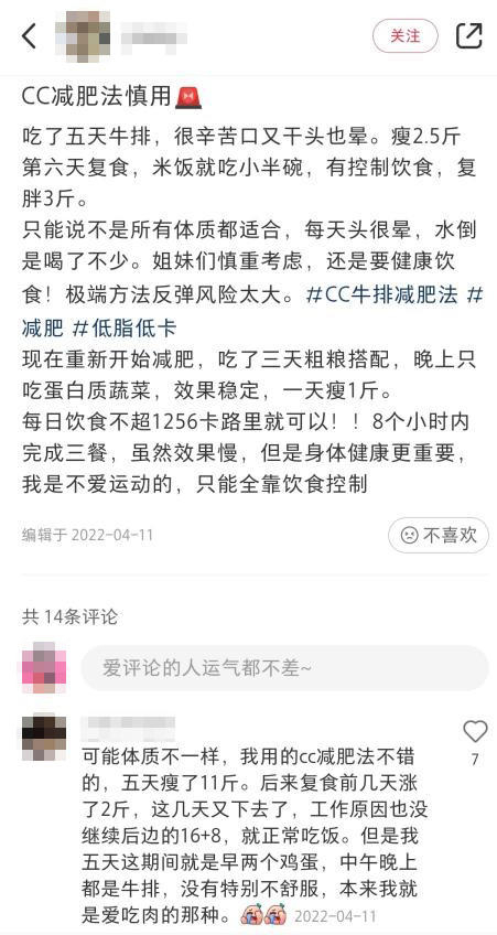 网友分享“cc牛肉减肥法”的不良体验经历。