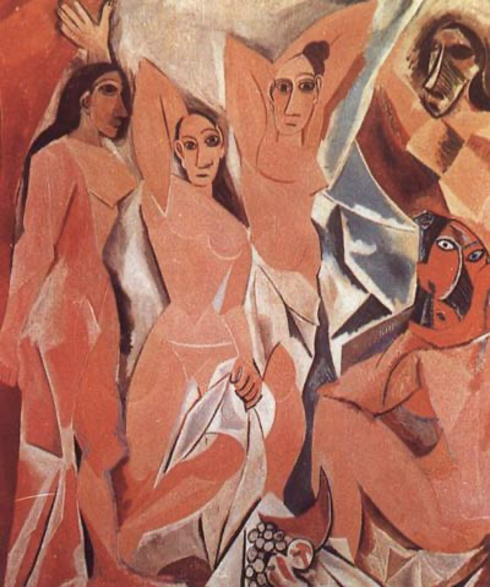 1907年,毕加索创作的《亚维农少女》不仅标志着毕加索个人艺术历程中的重大转折,也是西方现代艺术史上的一次革命性突破,它引发了立体主义运动的诞生。画面左边是三个裸女形象,显然是古典型人体的生硬变形,而右边两个裸女那粗野、异常的面容及体态,则充满了原始艺术的野性特质。
