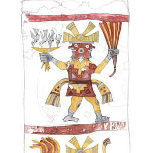 这些用线条描绘的壁画,单看细节就让人叹为观止。第一幅壁画靠近柱子的顶部,描绘的是一名朝相反方向看的双面男子。他一只手拿着一把羽毛扇,另一只手里拿着高脚酒杯,四只蜂鸟饮着酒杯里的水。