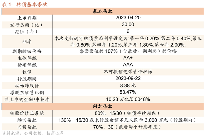 公司本期可转债发行规模为30亿元,发行期限6年。初始转股价为8.38元,按初始转股价计算,共可转换为3.58亿股神马股份A股股票。转债全部转股对公司A股总股本的稀释率为34.28%,对流通股(非限售)的稀释率为50.14%,稀释率较高。转股期从2023年9月22日起至可转债到期日(2029年3月15日)结束。从发行结果来看本期转债原股东配售比例为83.47%,配售比例较高。