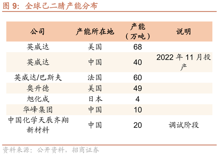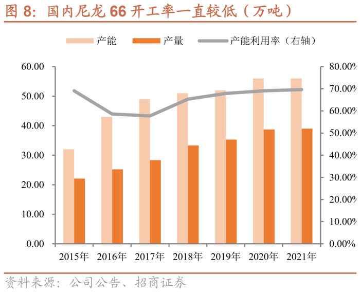 国内己二腈技术已经突破,有望进一步打开国内市场空间。2019 年以前国内没有一家企业能够生产己二腈,己二腈长期以来依赖进口,始终受到国外跨国公司控制,严重限制和影响了我国尼龙产业发展和产品竞争力。2019 年 7 月,华峰集团建成了国内首套产业化的 5 万吨己二腈生产装置,这是国内首个己二腈工业化生产项目;2019 年 8 月,中国化学旗下公司天辰齐翔开工建设 20 万吨/年己二腈生产装置,并于 2022 年7 月顺利产出第一批合格己二腈产品;公司已掌握丁二烯直接氢氰化制备己二腈技术,正积极推进 5 万吨己二腈项目建设。国内己二腈研发技术的突破有望打通己二腈—己二胺—尼龙66 全产业链,打破国外技术垄断,尼龙 66 全产业链进口替代将加快实现,将进一步拓展尼龙 66 的应用和需求空间。