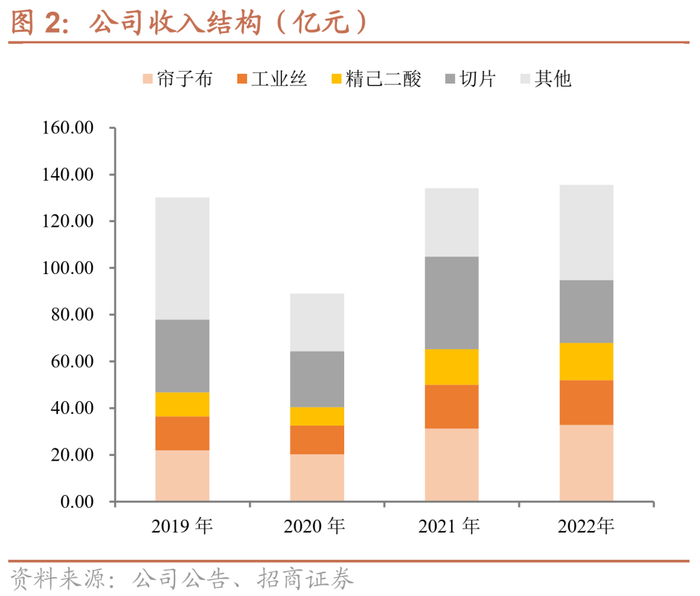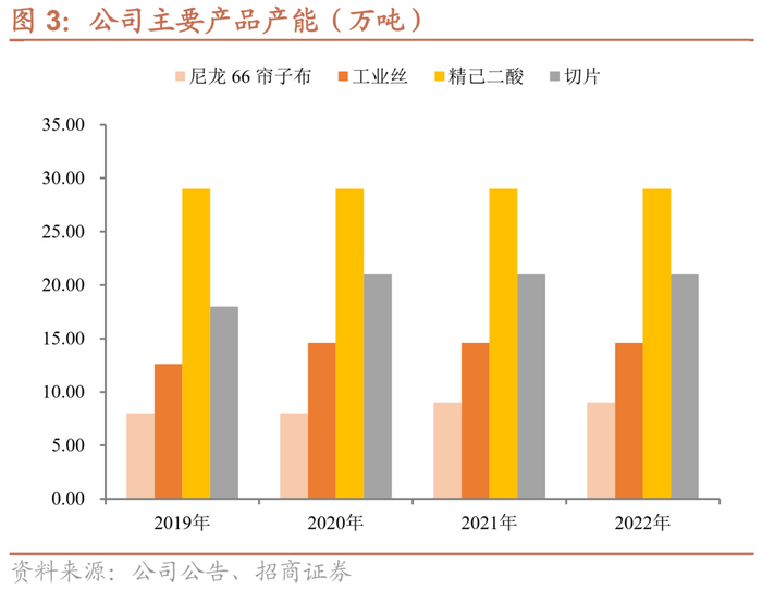 公司已经掌握了尼龙 66 的全套生产工艺,即以纯苯、氢气、己二腈等为原料生产合成己二酸、己二胺等中间体及尼龙 66 盐,主导产品尼龙 66 工业丝、帘子布、切片生产规模居于全国首位,公司生产的己二酸、己二胺作为生产尼龙 66 盐的中间体,主要自用,以满足生产尼龙 66 的需要,富余部分对外出售。上游原料包括己二酸、氢气,主要向集团采购,部分己二酸自产、纯苯向中石油与中石化采购;己二腈、己二胺主要向英威达采购。帘子布下游主要为轮胎,工业丝下游除帘子布外、还有安全气囊、帆布等其他领域,尼龙 66 切片下游包括汽车、工程机械、纺织服装等多个领域。截至2022年底,公司精己二酸产能29万吨,尼龙 66 帘子布、工业丝、切片年产能分别为9万吨/14.6万吨/21万吨。