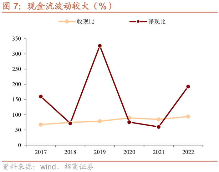 现金流波动较大。由于部分客户使用票据结算、导致公司收现比在100%以下,21年由于原材料大幅涨价、导致公司备货增加,经营现金流出加大,导致净现比在100%以下,不过22年恢复明显。整体上公司净现比未低于低于过60%,虽然波动较大、但也保持了相对不错的水平。
