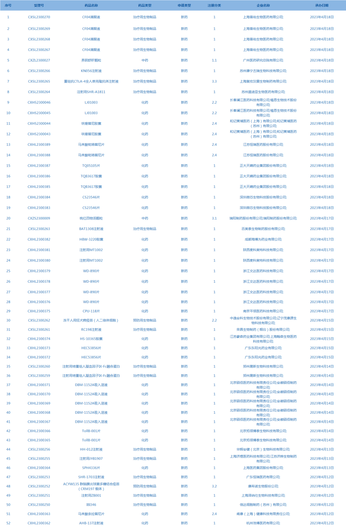 2.CDE承办受理52个新药上市申请,包括CF04滴眼液等药品。(截至4月18日)
