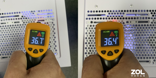 此时,利用激光测温枪隔着机箱顶部的散热孔反复寻找温度最高位置,最终测得水冷排头部温度为36.7℃,尾部温度为36.4℃,仅有0.3℃的温差,可见导热均匀性非常不错。