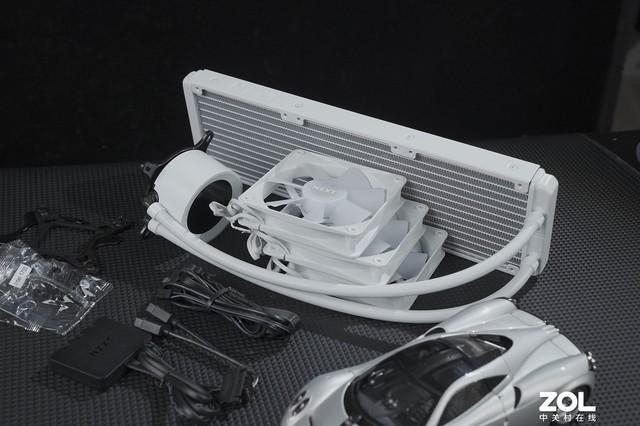 NZXT恩杰KRAKEN(海妖)ELITE RGB水冷散热器内部的配件非常丰富,同时可以看到散热器的整体部分,包括水冷头、水管、散热风扇外圈和水冷排都采用纯白色调,非常赏心悦目。但风扇和冷排并没有预装在一起,这是考虑到用户安装在机箱的不同位置时,风扇的电源线和RGB灯光线的方向不同。