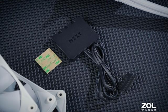 在风扇的RGB灯光方面,NZXT恩杰一向使用自家的控制系统,这个磁吸的灯光控制使用SATA电源插头供电,提供了三路NZXTRGB灯光输出,并用杜邦USB线连接到主板,再由NZXT CAM软件进行调节控制。