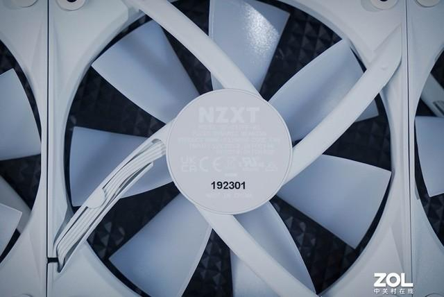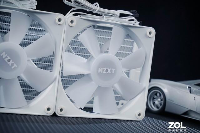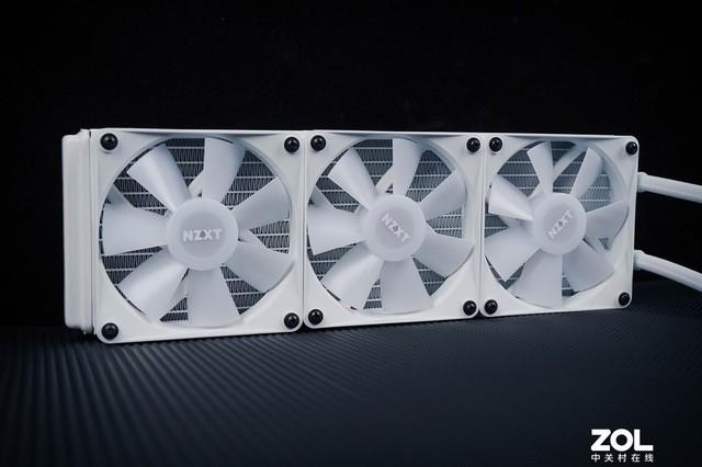 NZXT恩杰KRAKEN(海妖)ELITE RGB水冷排搭配三只12cm低噪音RGB风扇,风扇四角采用橡胶减震设计,能实现不错的减震效果。扇叶延续了NZXT恩杰一贯的硬朗造型,但材质换成了白色的半透明导光材料,并配备8颗LED灯珠,通电后可以实现均匀绚丽的整体灯光效果。